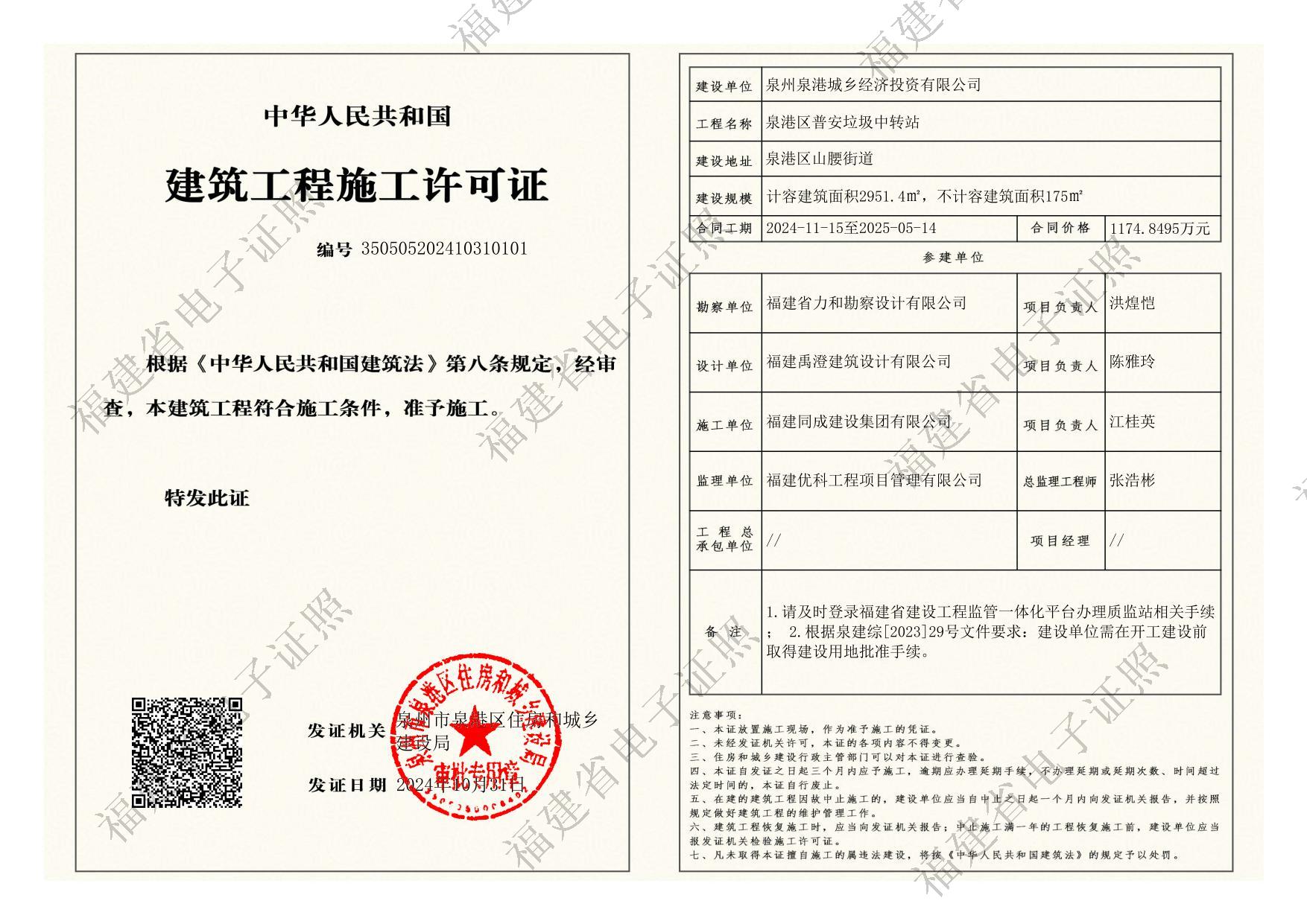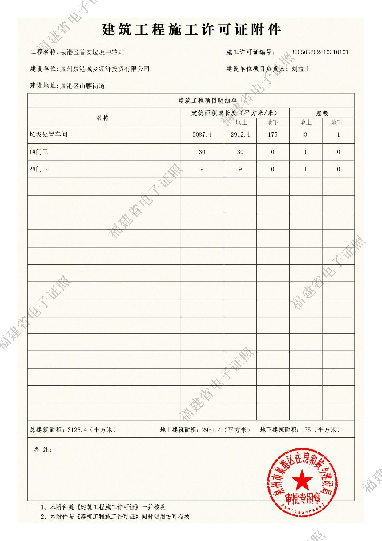 泉州泉港城乡经济投资有限公司伟德国际 普安垃圾中转站建筑工程施工许可证