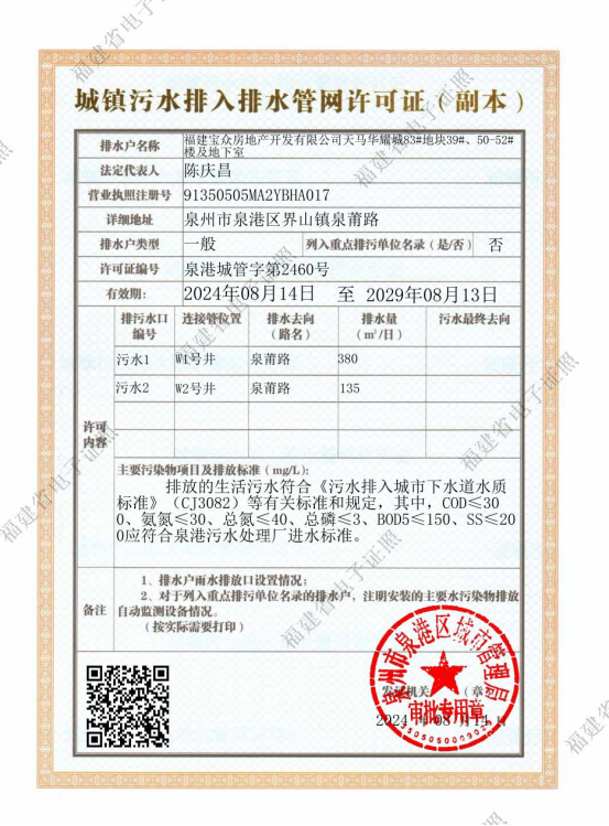 【结果公开】(市政服务)城镇污水排入排水管网许可证(泉港城管字第2460号)