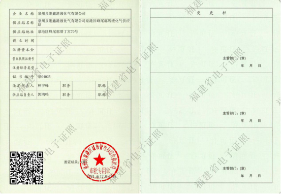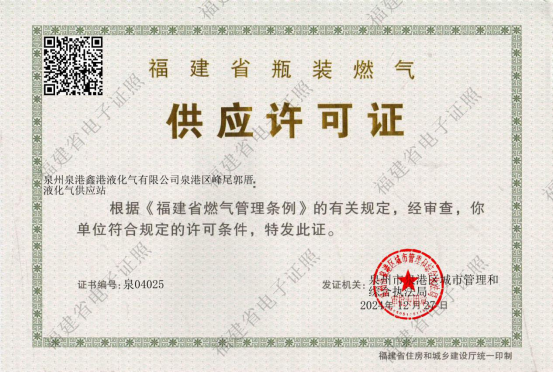 福建省瓶装燃气供应许可证(泉04025)