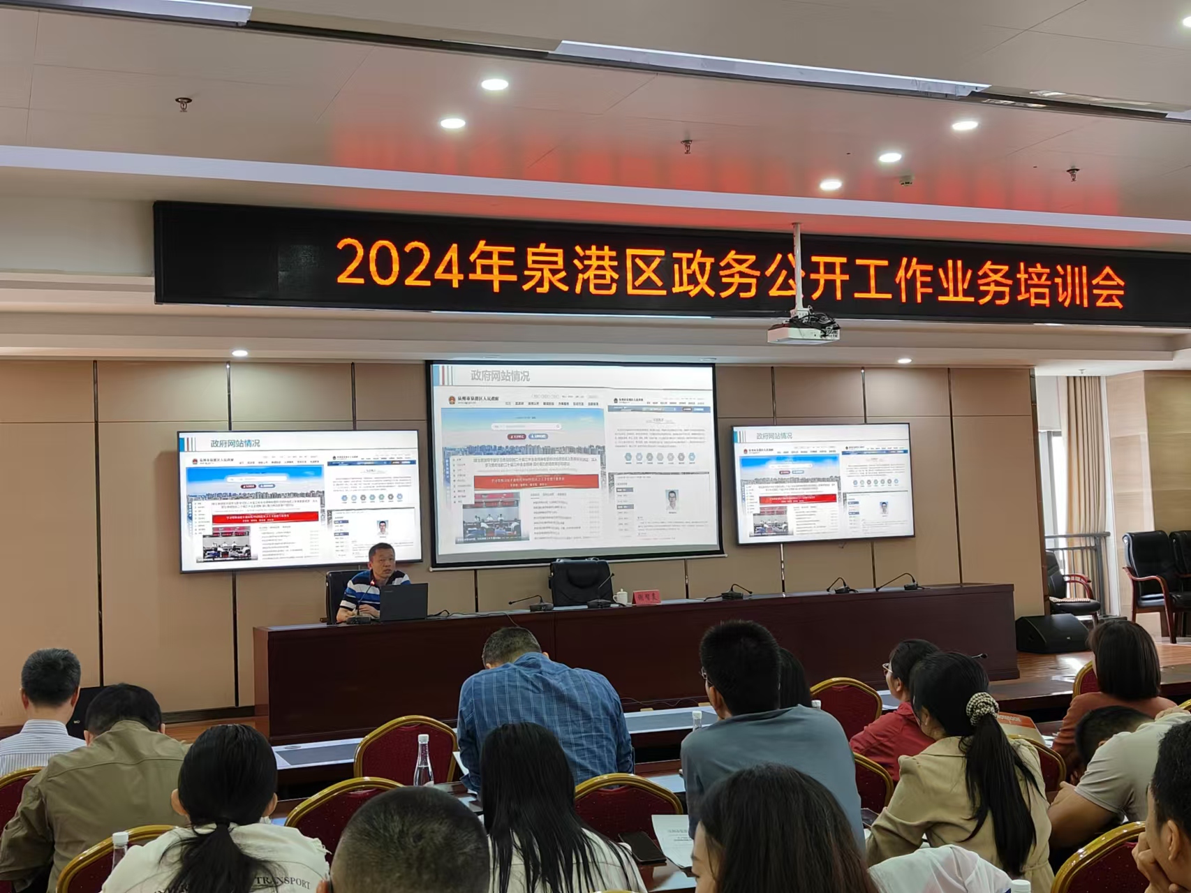 2024年度政务公开业务培训在区行政管理中心大楼举行,区政府办政务公开、政府网站和政务新媒体业务负责人分别就政务公开、政府网站和政务新媒体业务开展培训,重点讲解了政府网站和政务新媒体如何落实三审三校、用好内容安全审查系统和规范信息发布,2024年政务公开第三方评估指标体系(征求意见稿)以及政务公开、政府网站和政务新媒体工作中的有关问题。全区各单位政务公开工作负责人和业务人员近70人参加培训会。